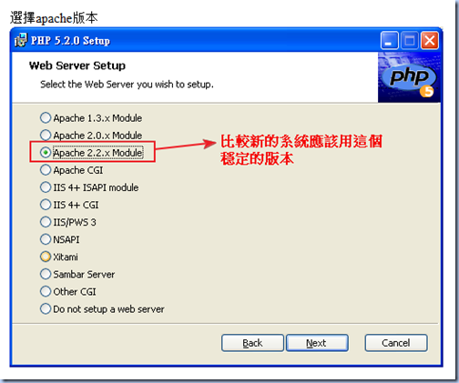 安裝 PHP 就花掉我蠻多時間,我參考的是 PHP5 系統環境安裝 Windows XP + PHP + Apache (一),教學中用的是 PHP 5.2.0,我想 5.3.1 更新,應該更優(我承認我喜歡裝最新版的軟體 …Orz),所以從 PHP 官網下載了 5.3.1 版的安裝檔開始安裝,沒想到經過種種設定就是無法與 Apache 正確運作,在 5.3.1 版的安裝畫面中不會有教學中「Web Server Setup」的畫面:
