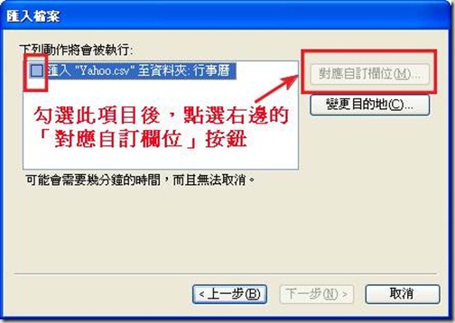 步驟十三:需勾選「匯入”Yahoo.csv”至資料夾:行事曆」左邊的方塊,而後點選右邊的「對應自訂欄位」按鈕,以設定欄位的對應