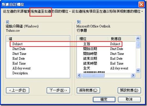 - 在 Outlook 的匯入檔案精靈中,要確實設定「自訂欄位對應」,才能正確匯入資料