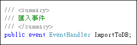 接著建立 User 可以委派的事件:ImportToDB 確認按鈕的 Click 事件則去呼叫 User 的委派事件