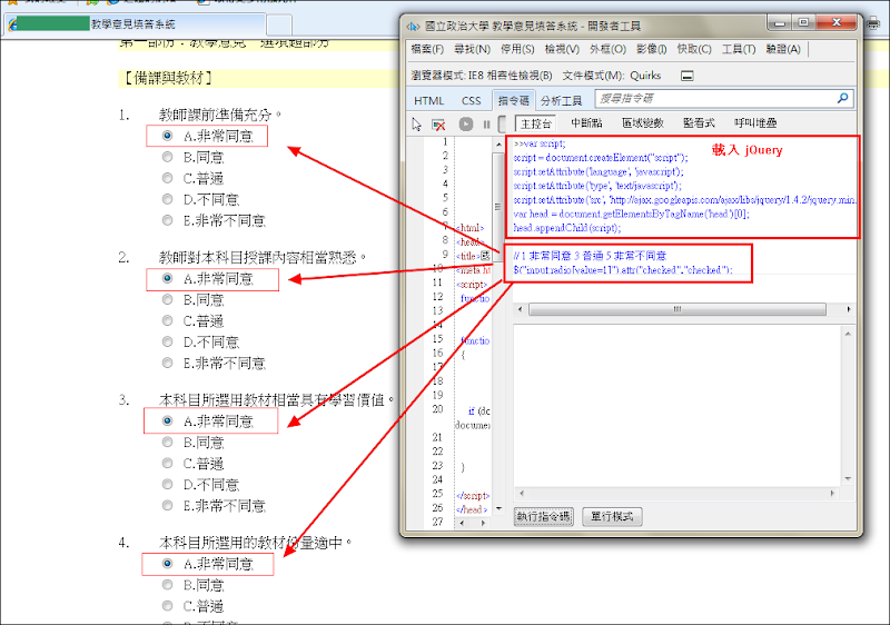 $("input:radio[value=1]").attr("checked","checked"); 接著打開 DevTool,把 Tab 切換至指令碼 將上述程式碼輸入並執行