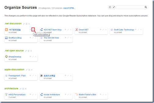 - 以拖拉 (drag-and-drop) 的方式重新安排訂閱項目:例如把某個 blog 從資料夾A移到資料夾B,在 Google Reader 裡面要做兩次設定才能完成 (把它加入資料夾B、把它從資料夾A中移除)。用拖拉的方式相當的直覺,用起來也很愉快。